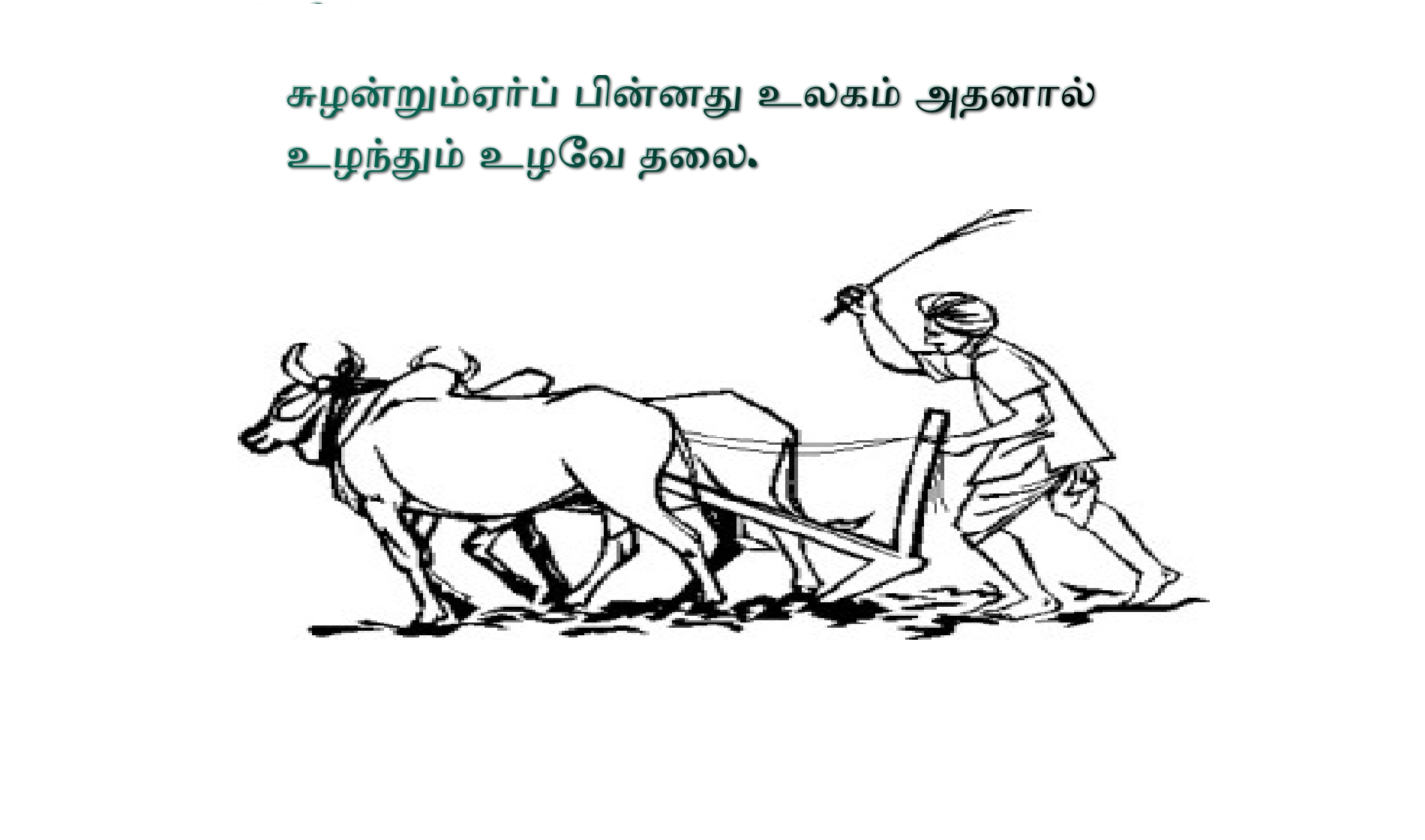 உழவன், ஒரு பலம் புழுதி கால் பலமாகும்படி தன் நிலத்தை உழுது காயவிட்டால், ஒரு பிடி எருவும் இடாமலேயே அந்நிலத்தில் பயிர் செழித்து வளரும். இக்குறளின் மூலம் உழுதலின் அவசியத்தை புரிந்து கொள்கின்றோம், நன்கு உழுவதன் மூலம் காற்றோட்டம் அதிகமாகிறது. நிலத்தில் உள்ள இலை தழை போன்றவையெல்லாம் மட்கி நல்லதொரு வளத்தை மண்ணிற்கு கொடுகின்றது என அறிகின்றோம். திருவள்ளுவர் உழவு எனும் அதிகாரத்திலேயே விவசாயம் பற்றிய பல விசயங்களை புரிய வைக்கின்றார்.“ஏரினும் நன்றால் எரு இடுதல் கட்டபின் நீரினும் நன்றதன் காப்பு”